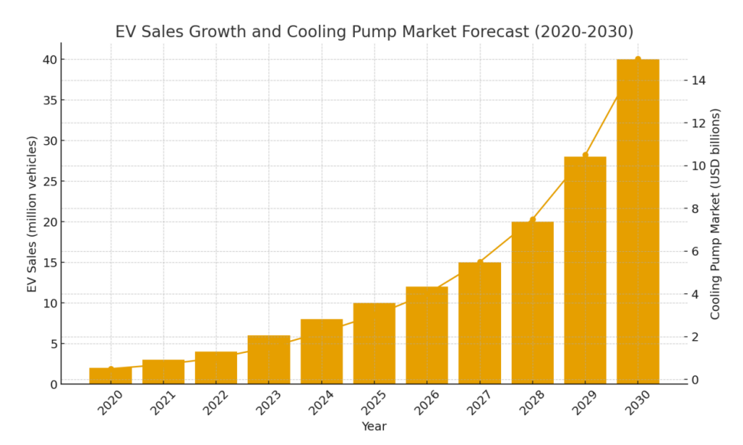 Рисунок 2. Прогноз продаж электромобилей и рынка насосов охлаждения (2020–2030 гг.)